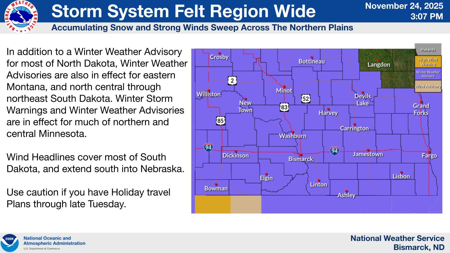 ** No Travel Advisory has been lifted in NW ND, although most of the state is under a Travel Alert, meaning roads are slippery, so leave extra time and slow down! **