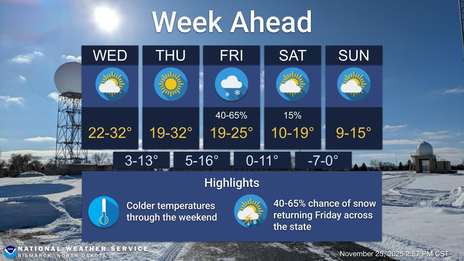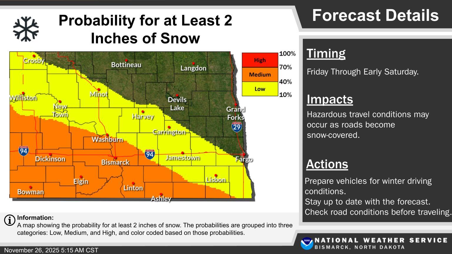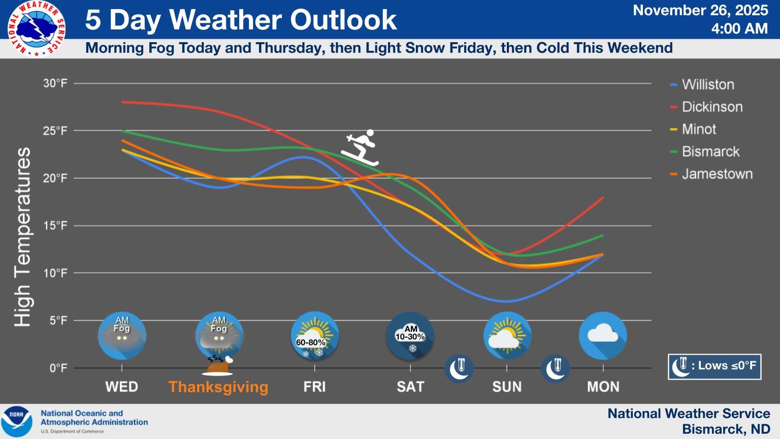 Today and Thanksgiving Day are expected to be drier, but areas of dense fog could develop across western and central North Dakota tonight. On Friday, another low pressure system could bring accumulating snow to southern parts of the region.