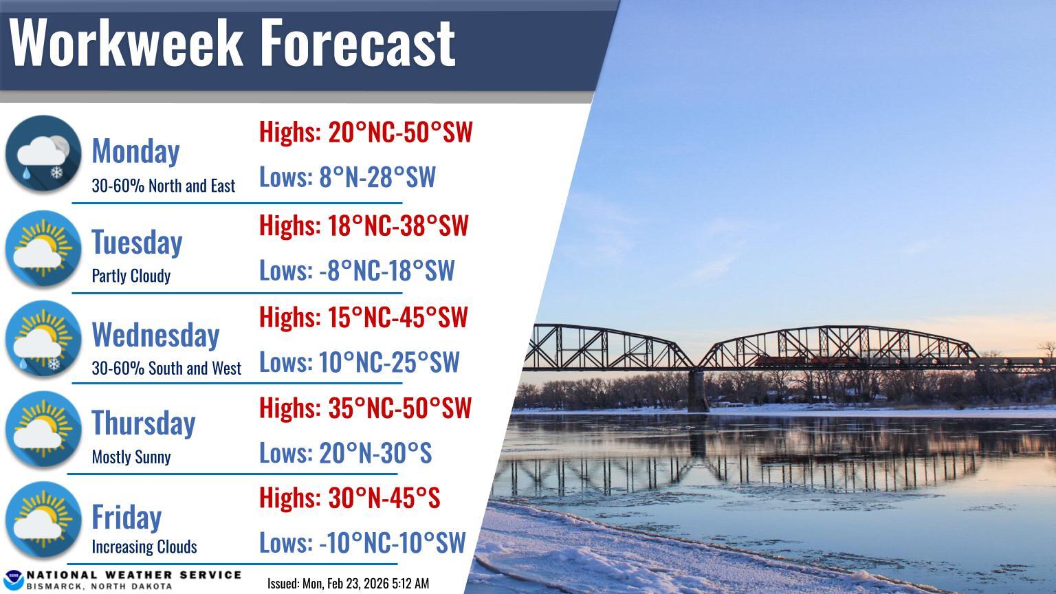 Warmer temperatures are then on tap for the upcoming workweek with most days seeing seasonable highs northeast to well above average highs southwest. On and off chances for light precipitation are also on tap for the workweek with light snow favored north and east and rain or a rain and snow mix southwest.