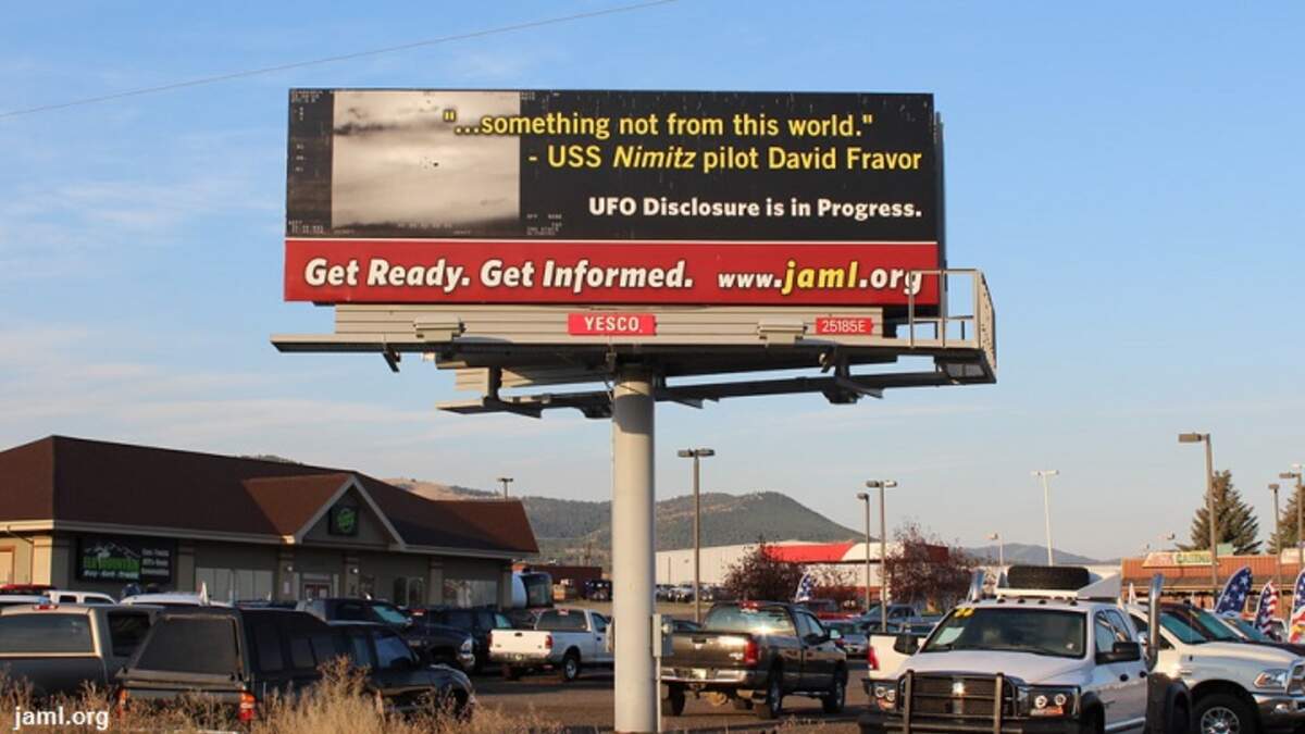 Motorists cruising down the highway in Montana are being asked to contemplate the implications of UFO disclosure by way of a new billboard ad that appeared last week. The signage, which is reportedly located near the city of Helena and is expected to be spotted by a whopping 46,000 drivers a month, features a still from the much-discussed Tic Tac UFO video with Navy commander David Fravor's quote "...something not from this world" alongside the image.